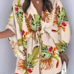 Printed V-Neck Bat Sleeve Button Drawstring Dress 2022 New