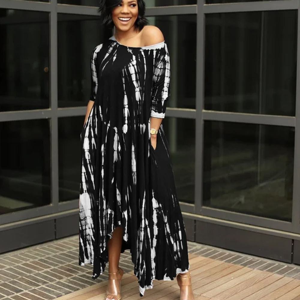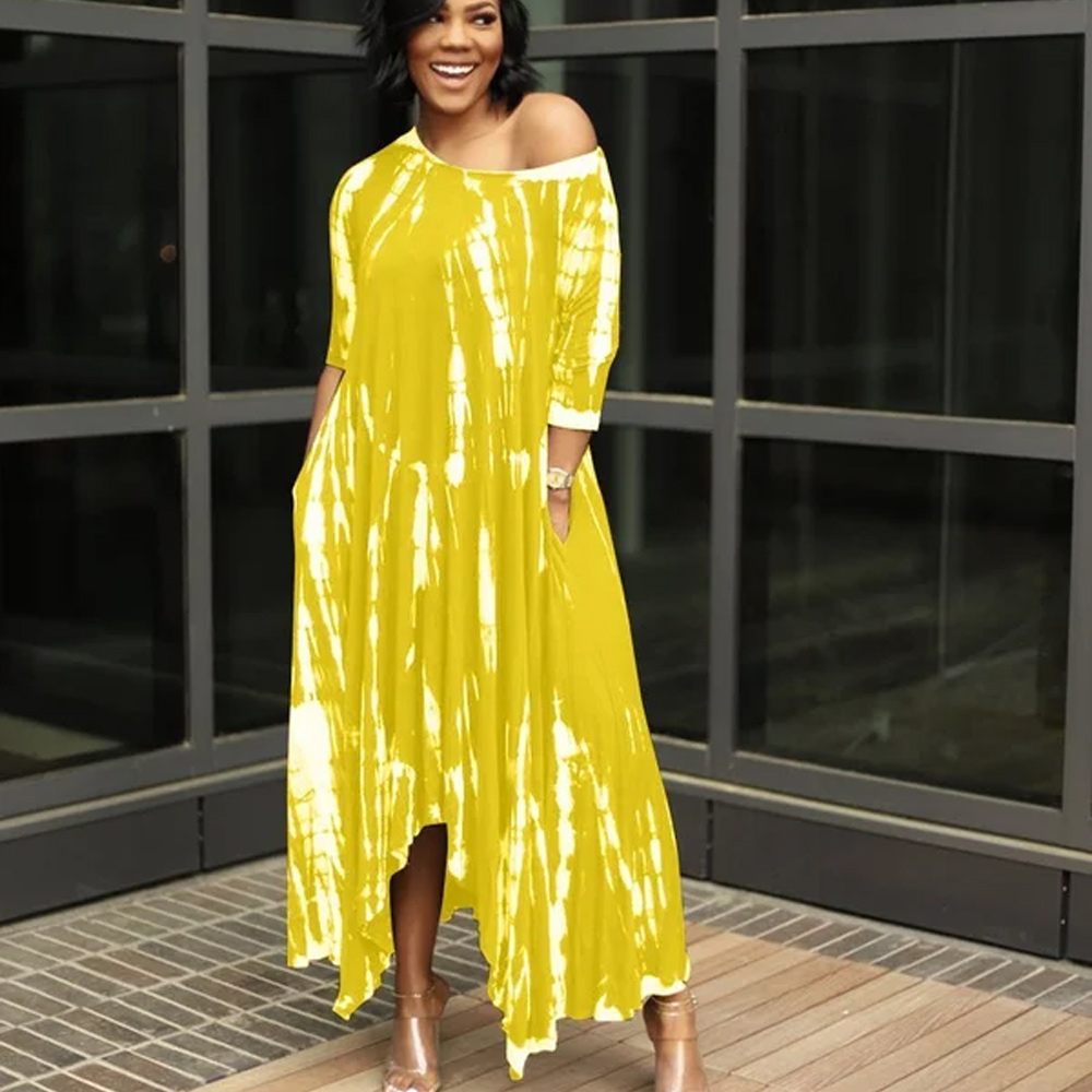 Off the shoulder Sleeve Loose Graffiti Tie-Dye Pocket Long Dress with slit