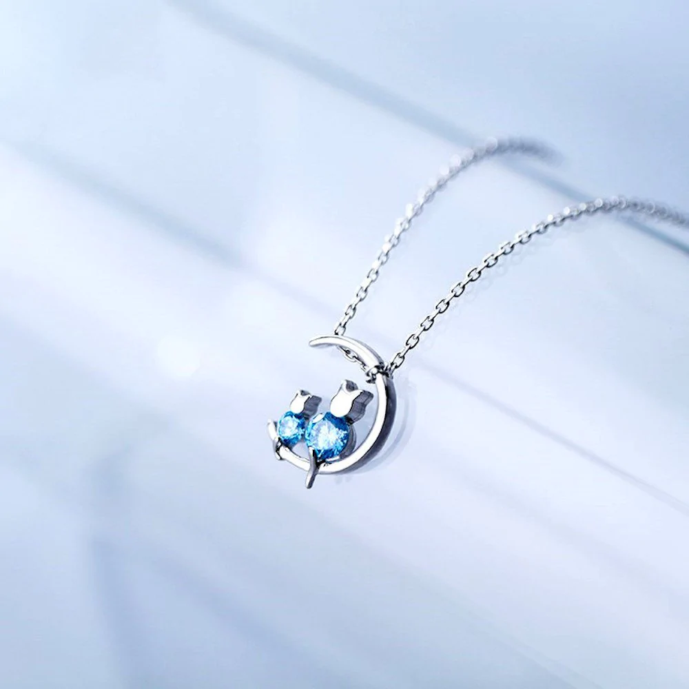Cats on Moon Blue Crystal Necklace