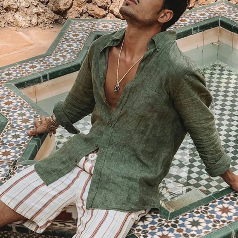 Men’s Cotton Linen Shirt Long Sleeve Loose Tops