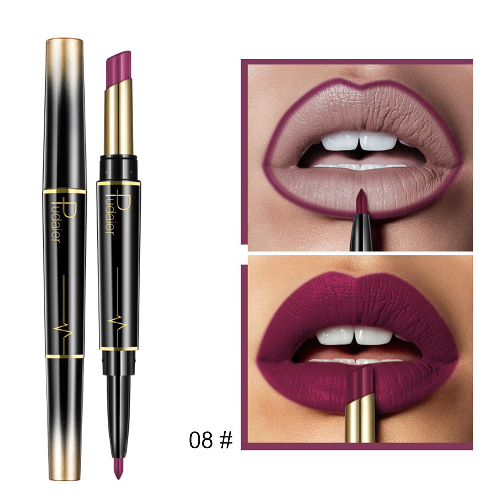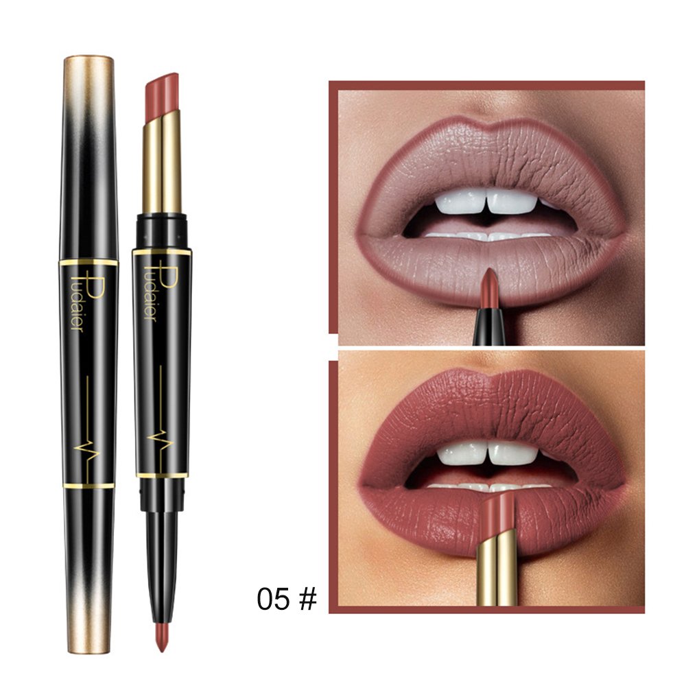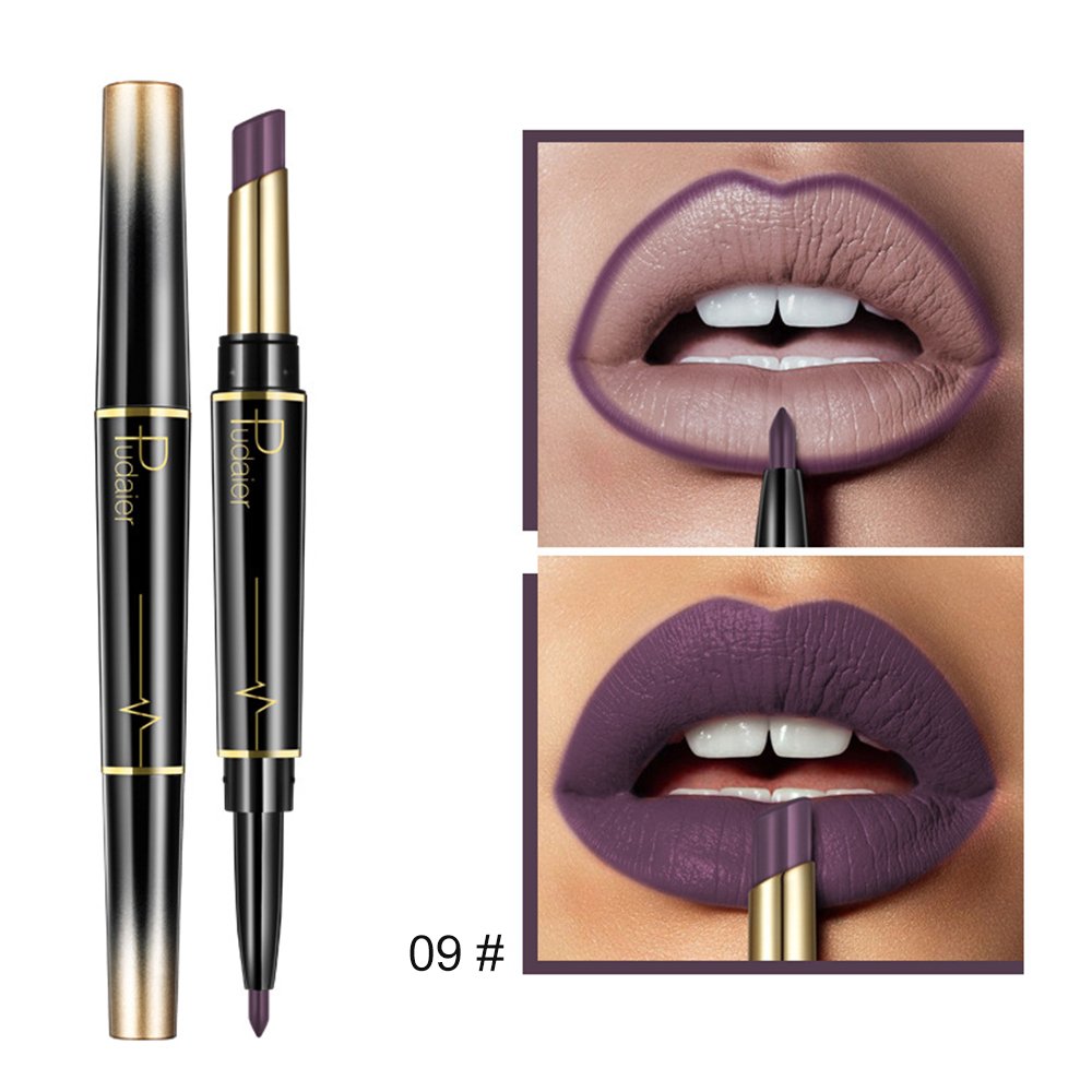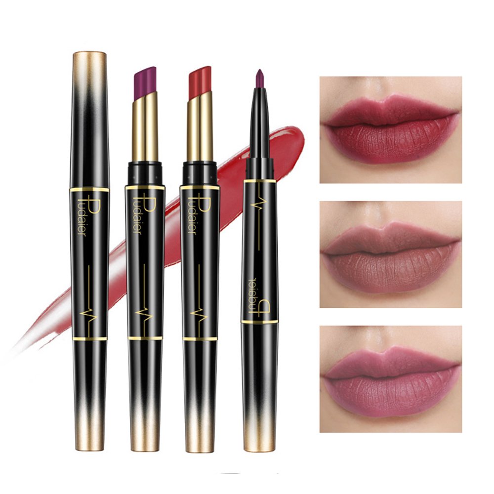- It has two heads with a lipstick on one side and a lip liner on the other side.