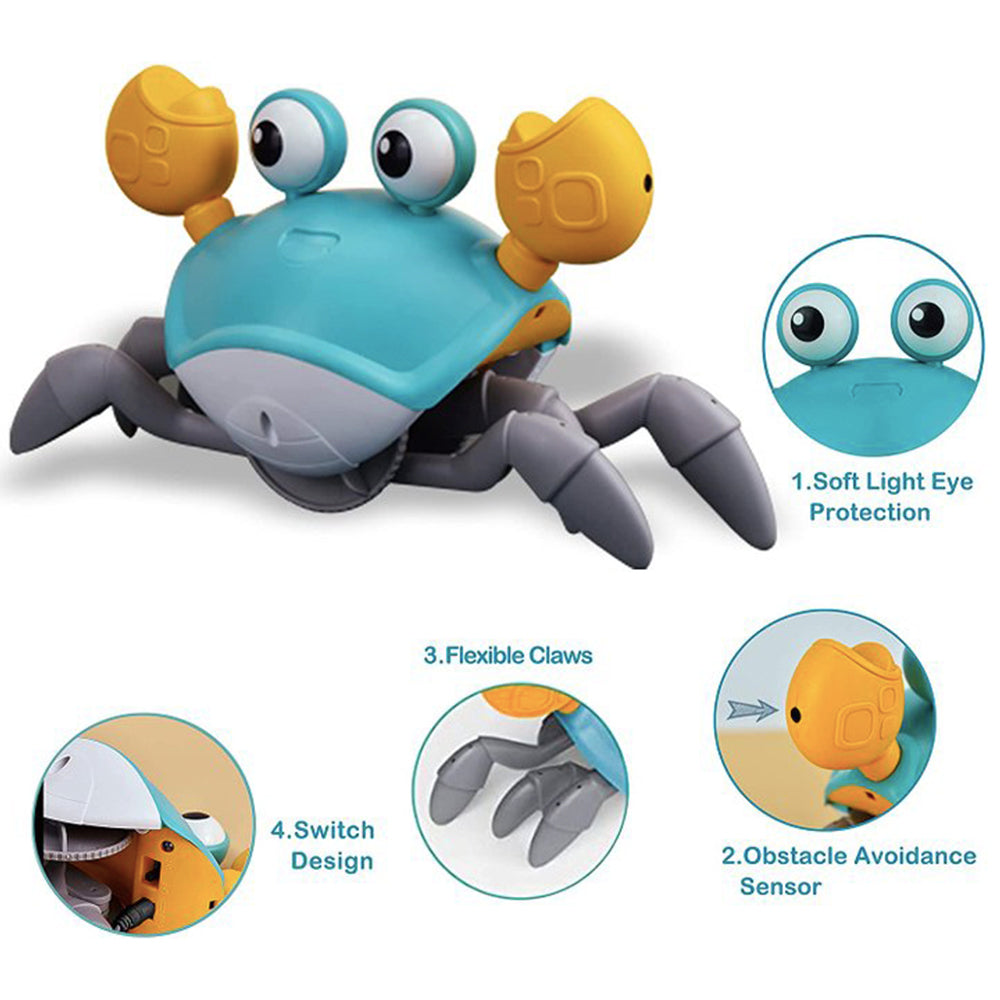 This lovely crab toy is equipped with an automatic-induction module that can regonize and make response the obstacles around it. So. when you try to catch it. it will move in the opposite direction.