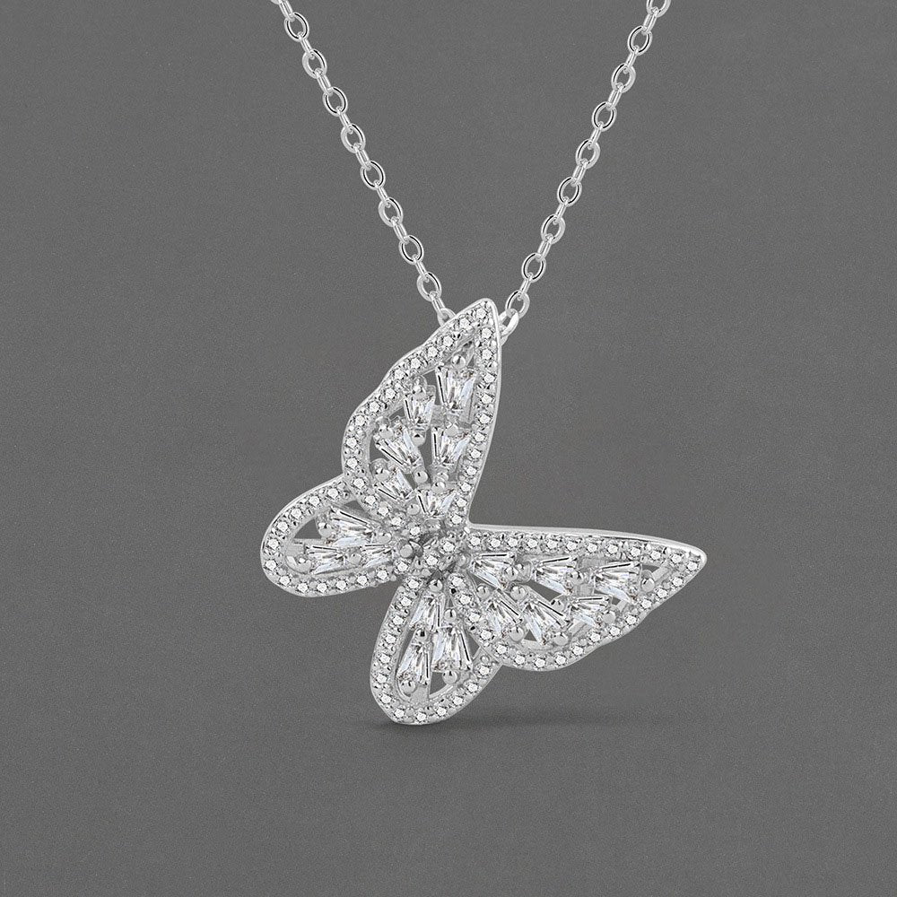 - Material: This silver butterfly necklace was made of Brass.silver plated. inlaid with 3A cubic zirconia. Lead-Free. Nickel-Free. It is safety for allergy sufferer. would not turn your skin green.