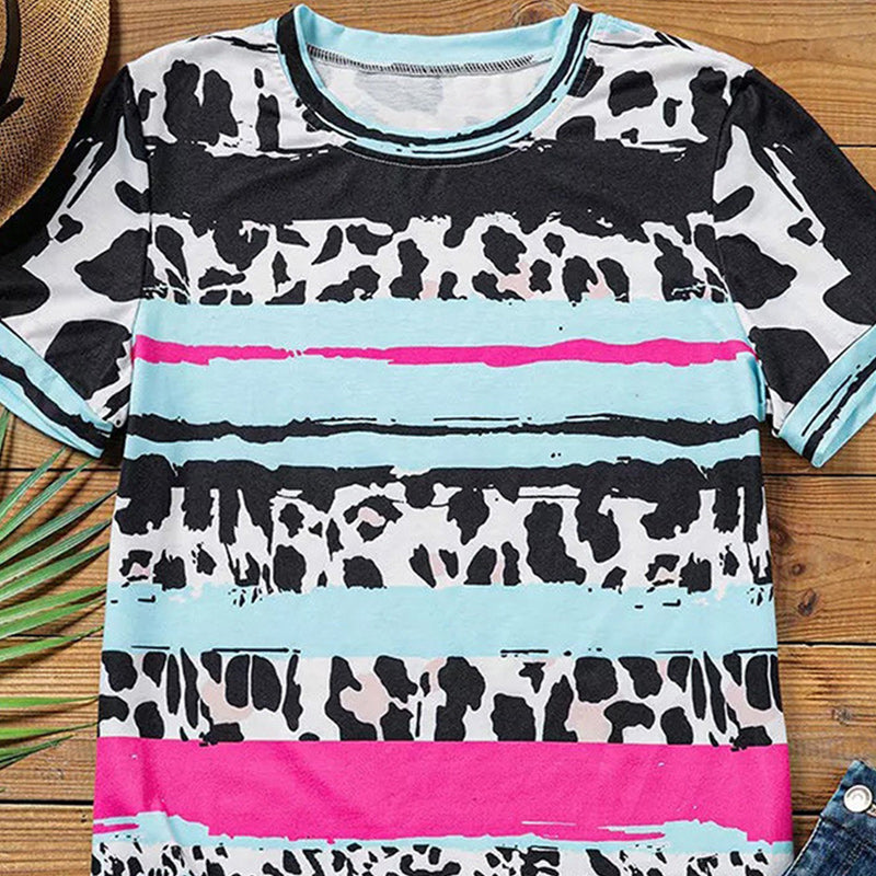 - A black and white leopard print base with pink stripes completes this stylish tee. Fresh and sweet. adding temperament. Suitable for many occasions.