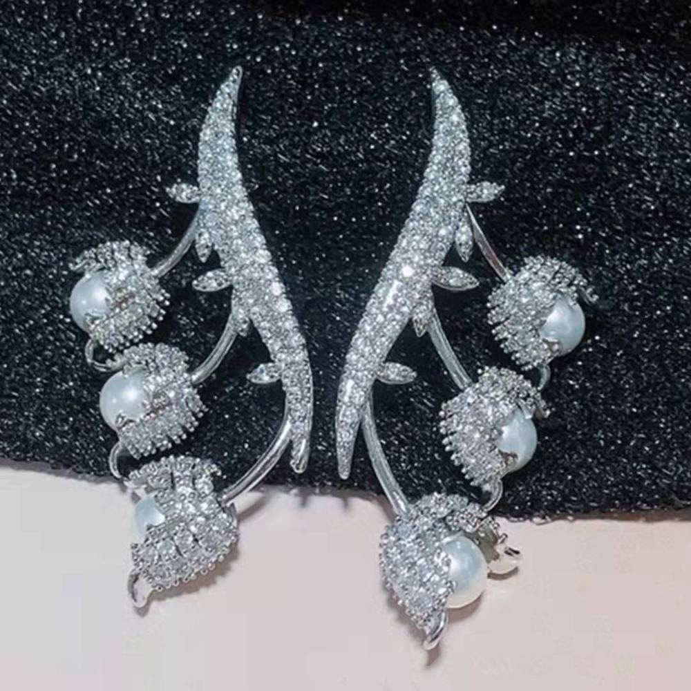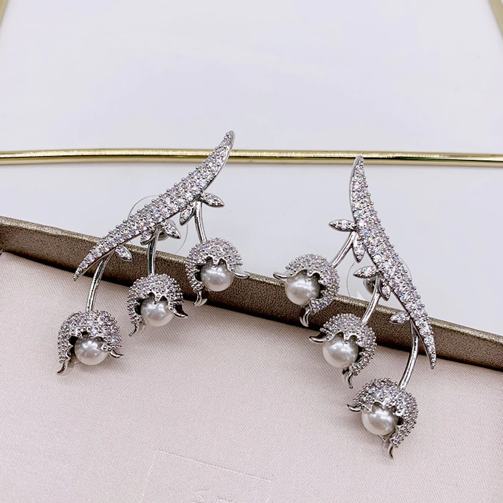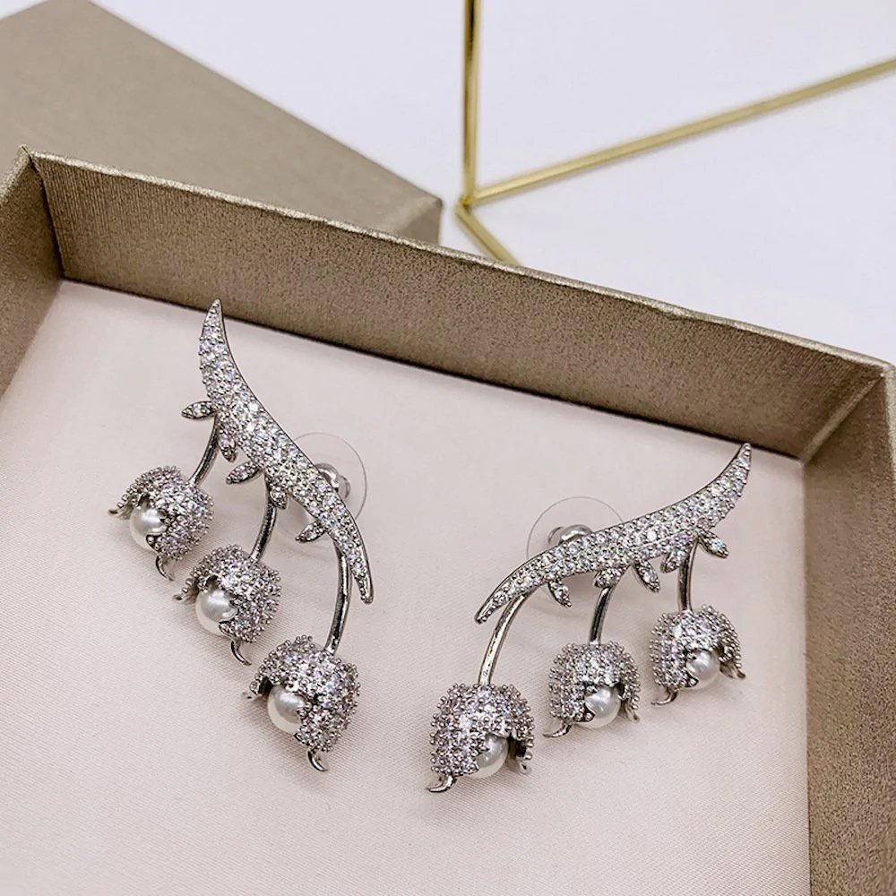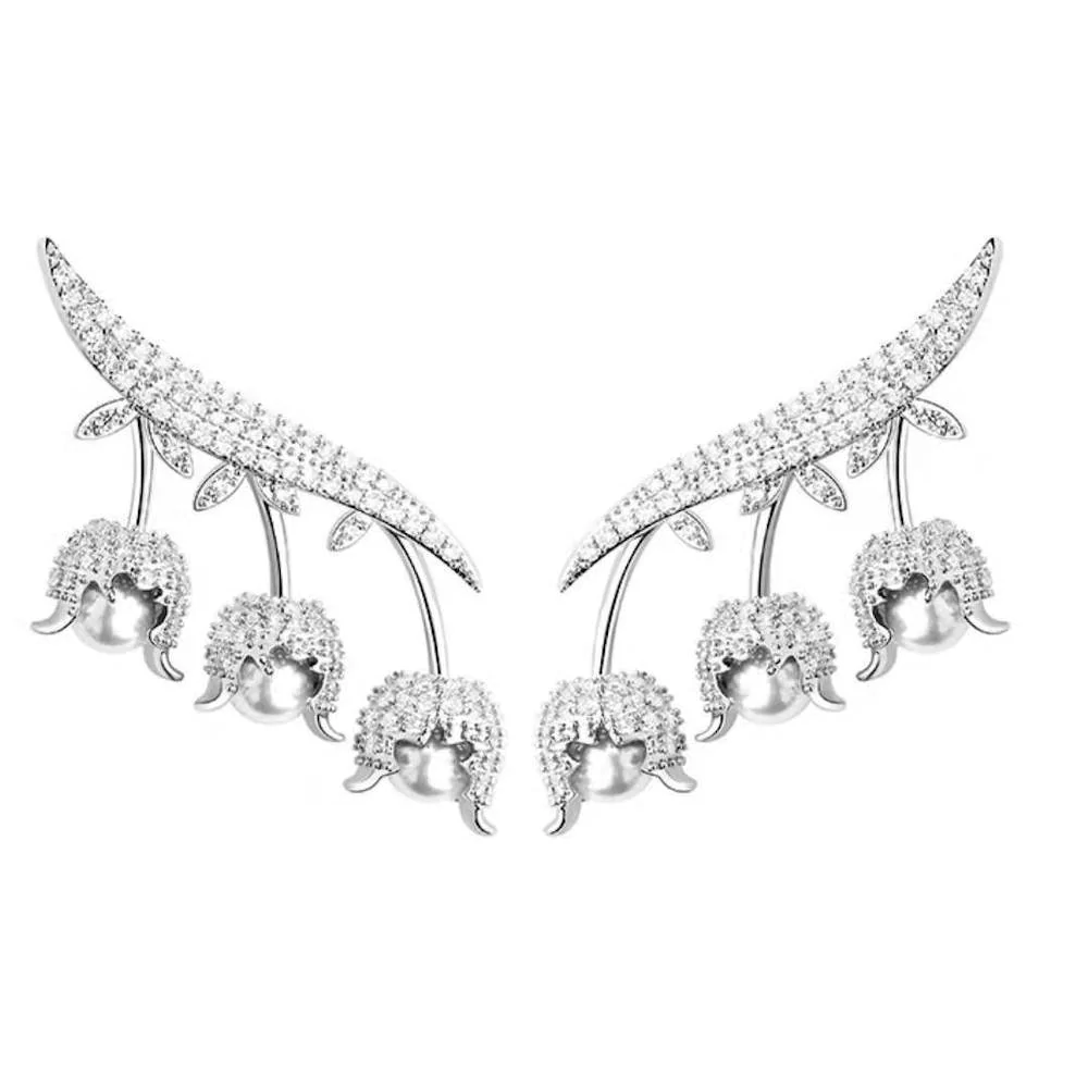 Elegent earrings offer a nature-inspired design resembling a floral vine featuring alternating round and marquise cubic zirconia stone clusters.