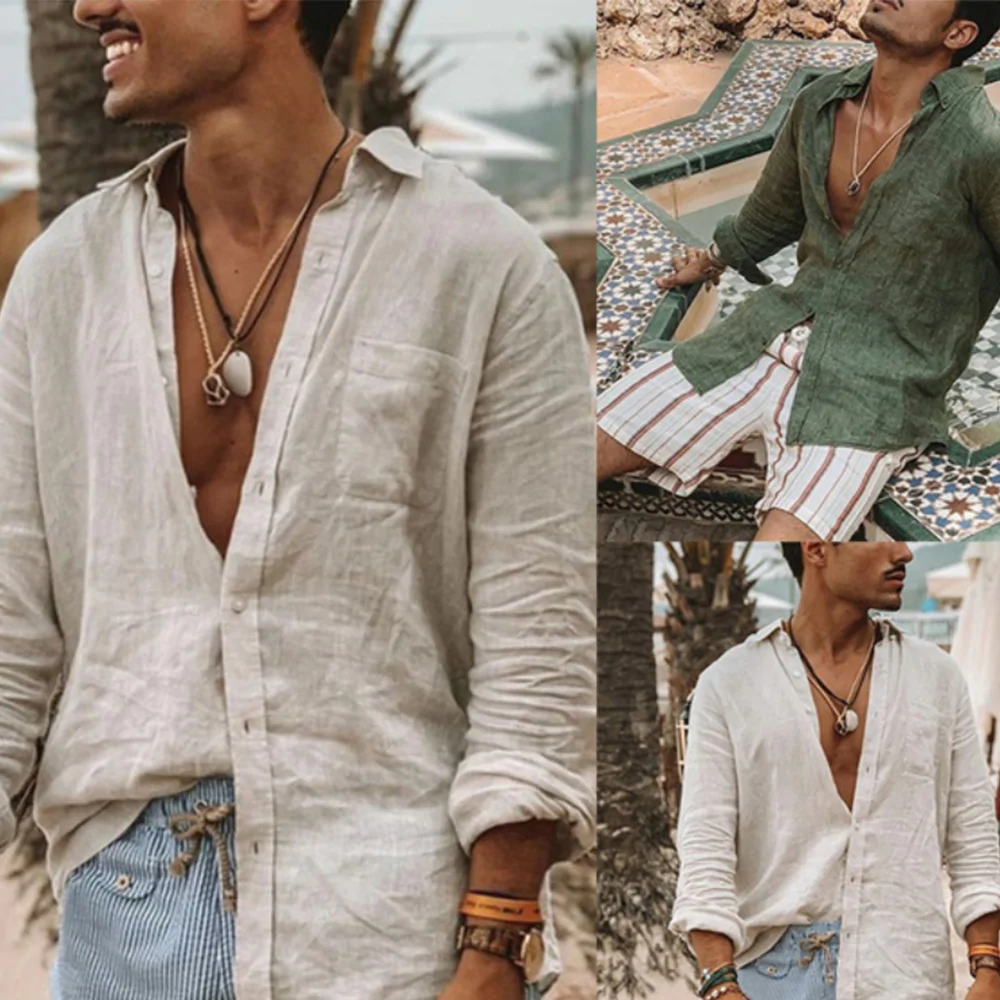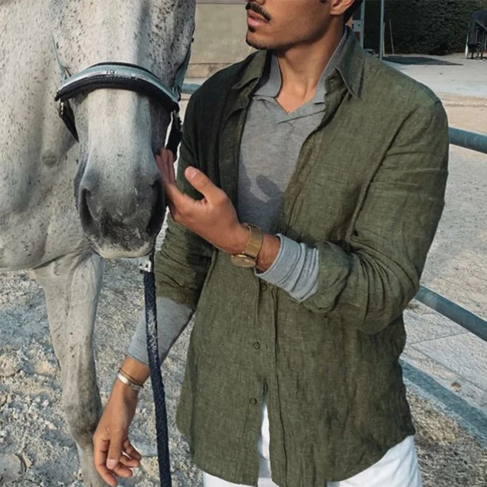 Men’s Cotton Linen Loose Lapel Long Sleeve Shirt