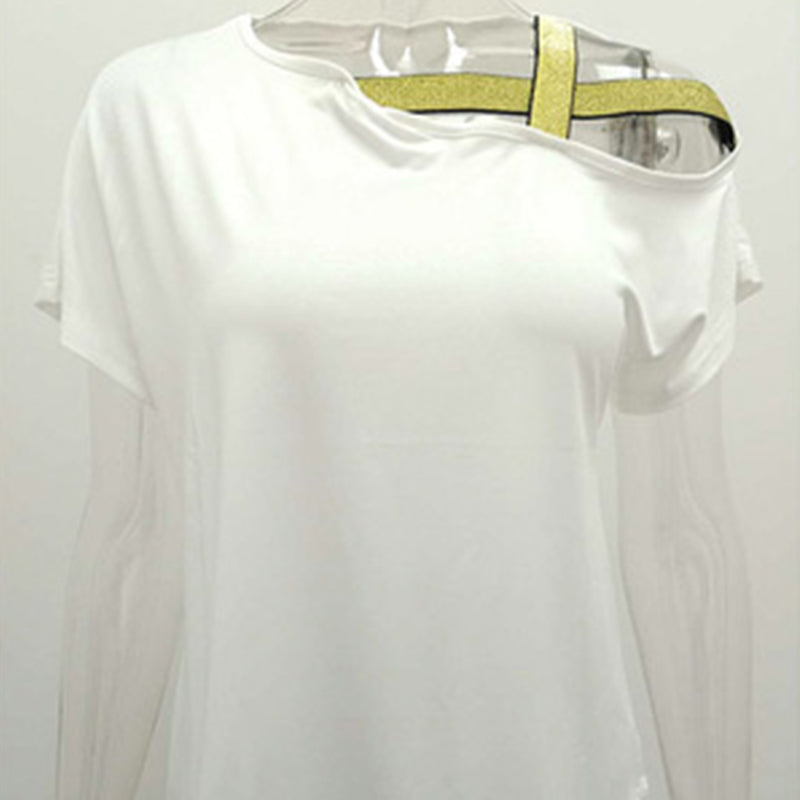 • This T-shirt is designed with slanted shoulders and crossed gold trim. which brings a sense of fashion and art to the solid color T-shirt. A variety of colors. each with its own unique style.