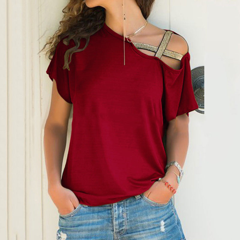 Spring And Summer Solid Color Casual Slanted Shoulder Cross Irregular Short Sleeve Women’s T-Shirt