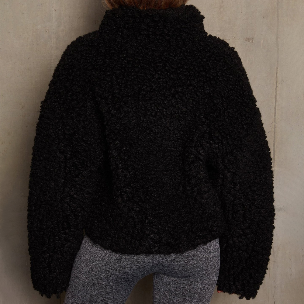 - Long sleeve.2 slant pockets.turn down collar.warm fashion lounge cropped fleece fuzzy jacket for winter