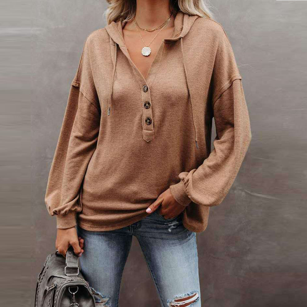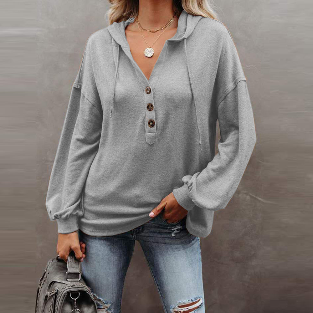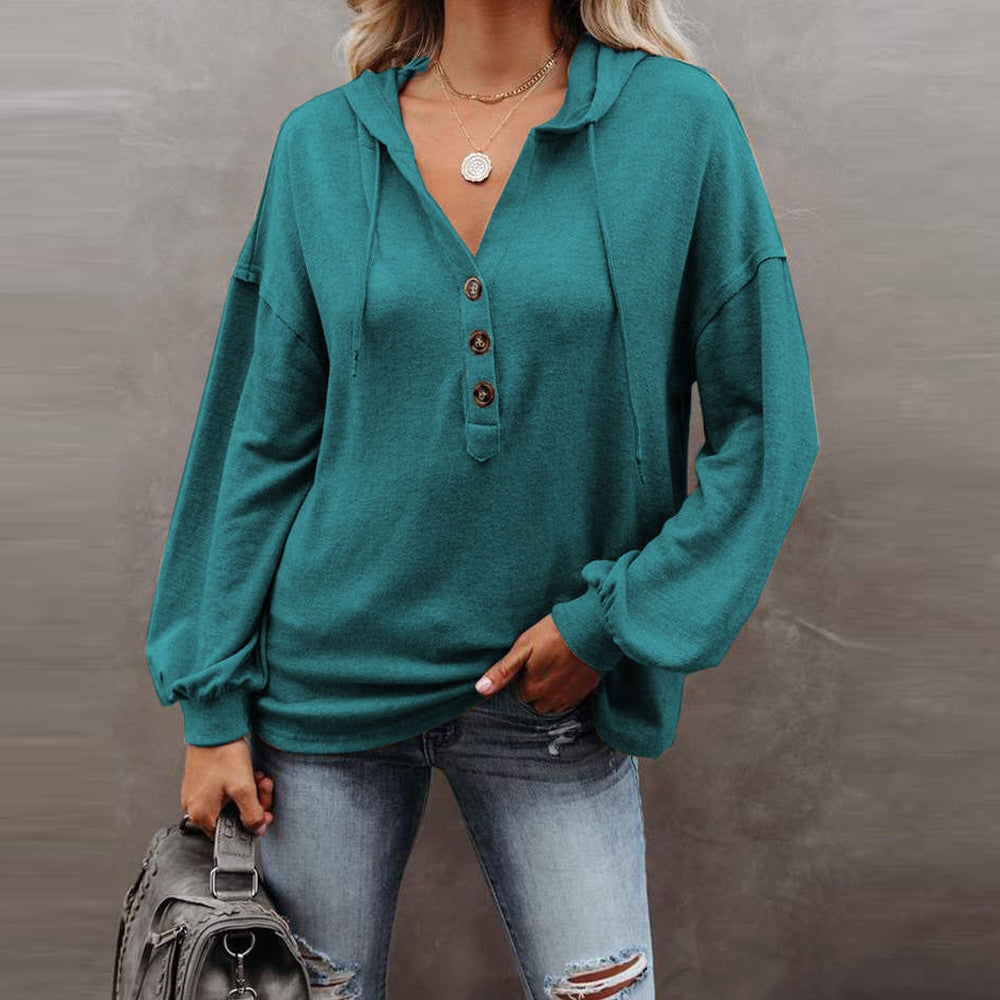 - 1*Women’s Solid Color V-Neck Button Hooded Loose Long Sleeve Sweatshirt